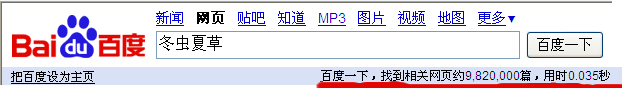 1. 相關(guān)頁(yè)面數(shù)量,指在搜索結(jié)果頁(yè)面,上部右側(cè)顯示的一個(gè)數(shù)據(jù)。舉例如下,圖中紅線部分就是關(guān)鍵詞“冬蟲夏草”的相關(guān)頁(yè)面數(shù)量: 在百度搜索“冬蟲夏草”后的截圖: