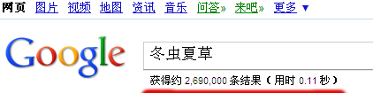 在谷歌搜索“冬蟲夏草”后的截圖: 2. 表中Baidu.com指百度;Google.cn指谷歌;Yahoo.cn指中國(guó)雅虎;tw.yahoo.com指雅虎奇摩Google.com指針對(duì)英文SEO服務(wù)的英文Google。 |