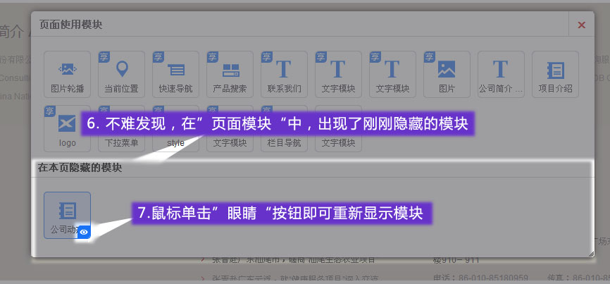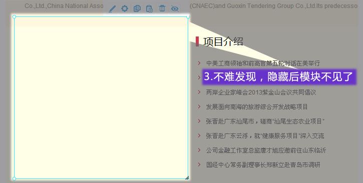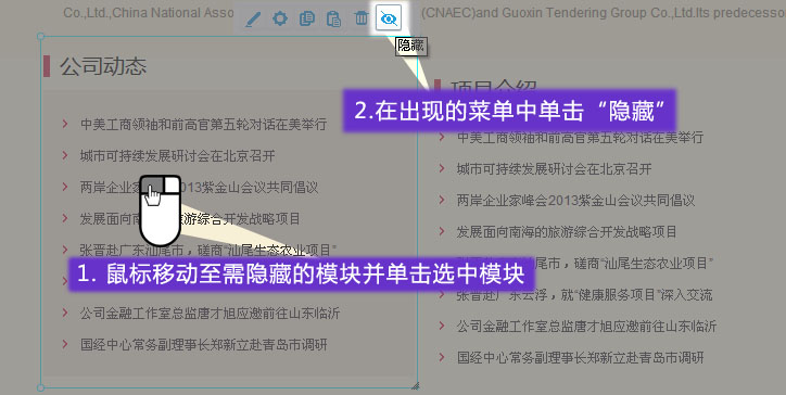 1. 進(jìn)入網(wǎng)站編輯模式,在需隱藏的模塊上單擊選中,并選中隱藏
