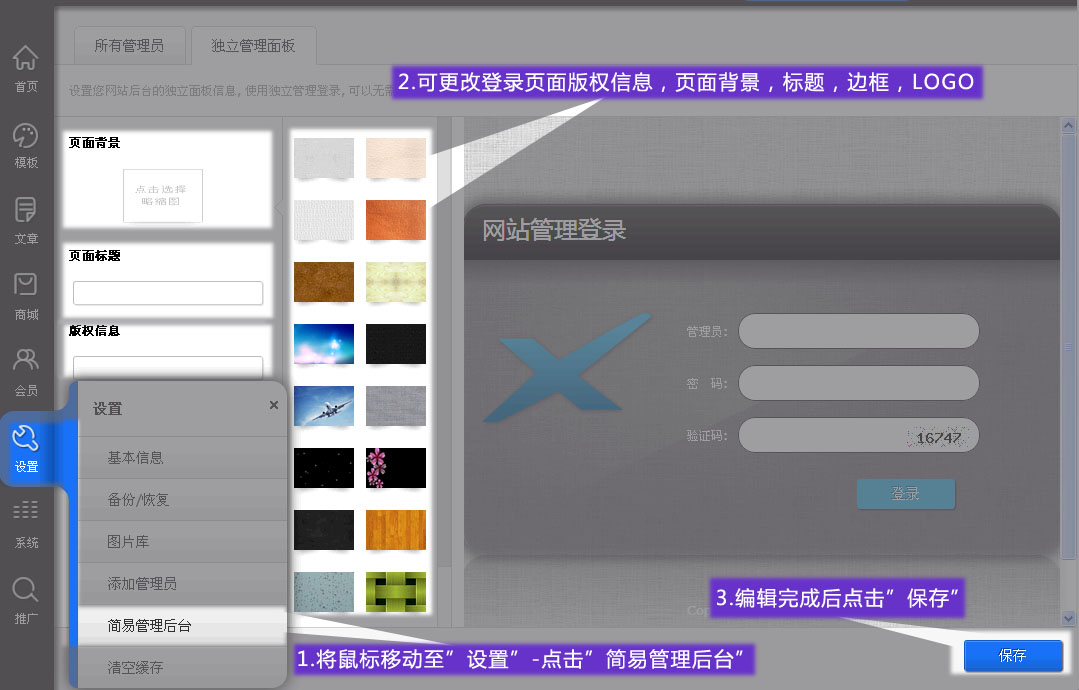 簡(jiǎn)易后臺(tái)指使用新建管理員賬號(hào)登錄的簡(jiǎn)易控制中心,可以設(shè)置管理員的權(quán)限,并且可以更改登錄界面,使得用戶感覺(jué)是完全獨(dú)立的控制后臺(tái)