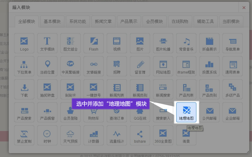 1. 在適當(dāng)?shù)奈恢,添加?b>地理地圖”模塊