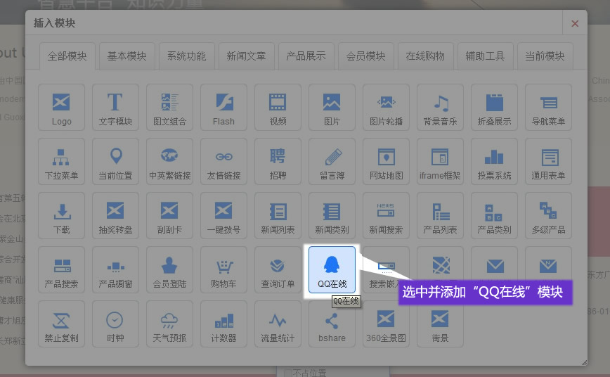 1. 在適當(dāng)?shù)奈恢茫砑印?b>QQ在線”模塊