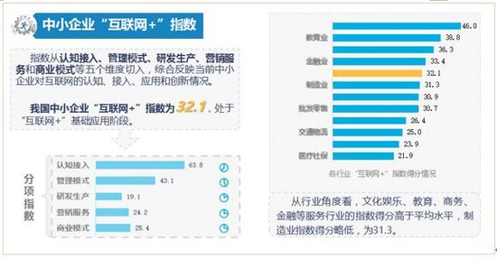 數(shù)據(jù)顯示,我國中小企業(yè)“互聯(lián)網(wǎng)+”指數(shù)為32.1,處于“互聯(lián)網(wǎng)+”基礎(chǔ)應(yīng)用階段。